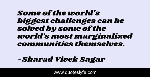 This page presents the quote "Some of the world's biggest challenges can be solved by some of the world's most marginalized communities themselves.". Author of this quote is Sharad Vivek Sagar. This quote is about impact, empowerment, entrepreneurship, challenges, communities, social-impact, change,.