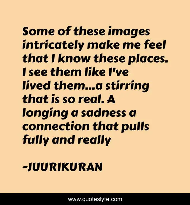 This page presents the quote "Some of these images intricately make me feel that I know these places. I see them like I've lived them...a stirring that is so real. A longing a sadness a connection that pulls fully and really". Author of this quote is JUURIKURAN. This quote is about life, magic,.