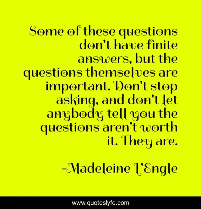 This page presents the quote "Some of these questions don't have finite answers, but the questions themselves are important. Don't stop asking, and don't let anybody tell you the questions aren't worth it. They are.". Author of this quote is Madeleine L'Engle. This quote is about questions, discovery,.