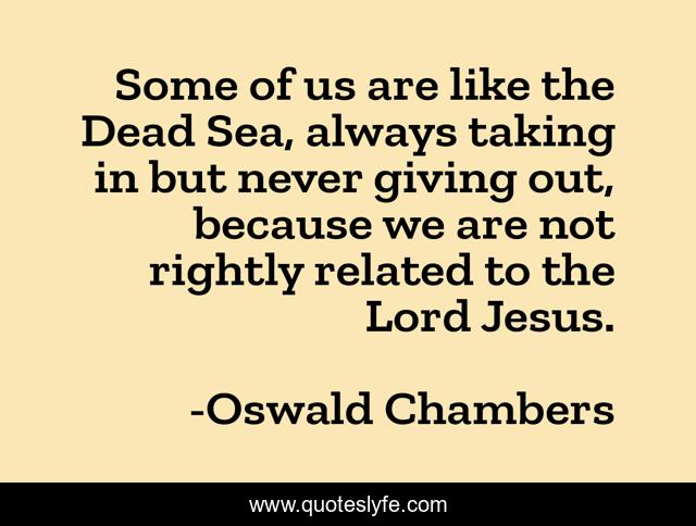 This page presents the quote "Some of us are like the Dead Sea, always taking in but never giving out, because we are not rightly related to the Lord Jesus.". Author of this quote is Oswald Chambers. This quote is about giving, the-lord-jesus, taking,.