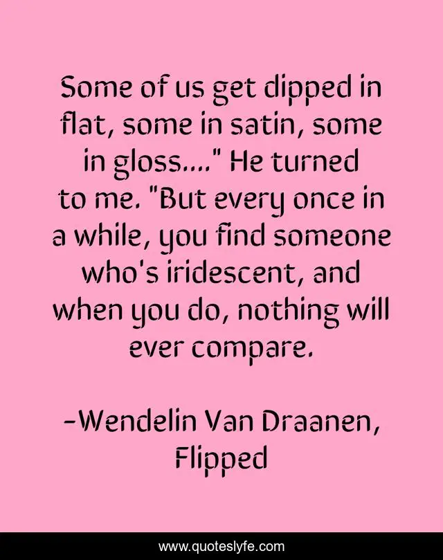 This page presents the quote "Some of us get dipped in flat, some in satin, some in gloss...." He turned to me. "But every once in a while, you find someone who's iridescent, and when you do, nothing will ever compare.". Author of this quote is Wendelin Van Draanen, Flipped. This quote is about individuality, beauty, people, ebullience, life, enthusiasm,.