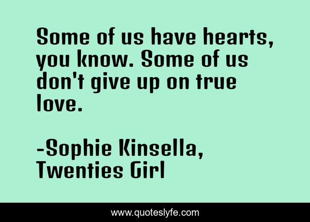 This page presents the quote "Some of us have hearts, you know. Some of us don't give up on true love.". Author of this quote is Sophie Kinsella, Twenties Girl. This quote is about true-love, heart, forever, love, heartbreak, affection,.