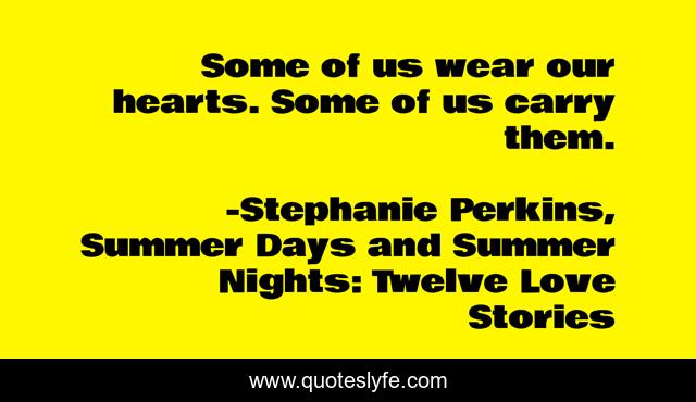 This page presents the quote "Some of us wear our hearts. Some of us carry them.". Author of this quote is Stephanie Perkins, Summer Days and Summer Nights: Twelve Love Stories. This quote is about beautiful, leigh-bardugo, eli-and-gracie, live, summer,.