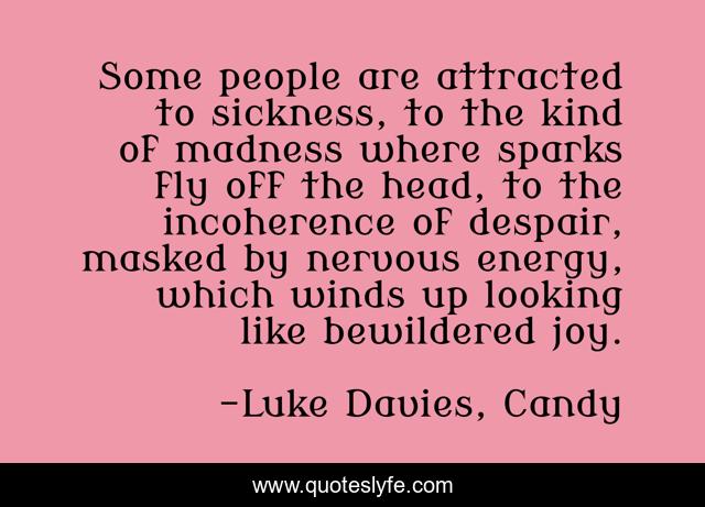 This page presents the quote "Some people are attracted to sickness, to the kind of madness where sparks fly off the head, to the incoherence of despair, masked by nervous energy, which winds up looking like bewildered joy.". Author of this quote is Luke Davies, Candy. This quote is about bewildered, madness, incoherence, sickness, sparks, joy, energy, attracted, despair,.