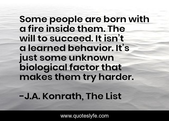 This page presents the quote "Some people are born with a fire inside them. The will to succeed. It isn’t a learned behavior. It’s just some unknown biological factor that makes them try harder.". Author of this quote is J.A. Konrath, The List. This quote is about quotable, greatness,.
