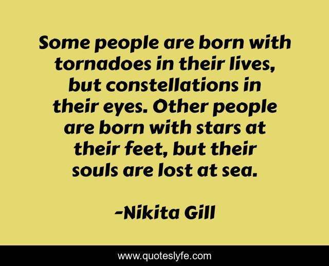 This page presents the quote "Some people are born with tornadoes in their lives, but constellations in their eyes. Other people are born with stars at their feet, but their souls are lost at sea.". Author of this quote is Nikita Gill. This quote is about life, love, dream-big, constellations, stars, nikitagill, affection, perspectives,.