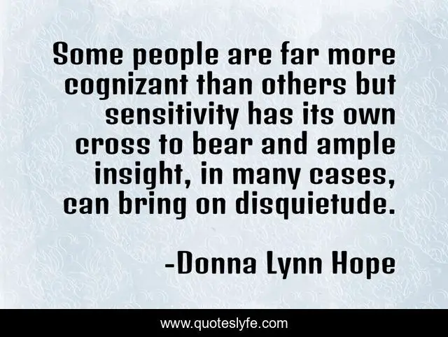 This page presents the quote "Some people are far more cognizant than others but sensitivity has its own cross to bear and ample insight, in many cases, can bring on disquietude.". Author of this quote is Donna Lynn Hope. This quote is about empath, sensitivity, empathy, sensitive,.