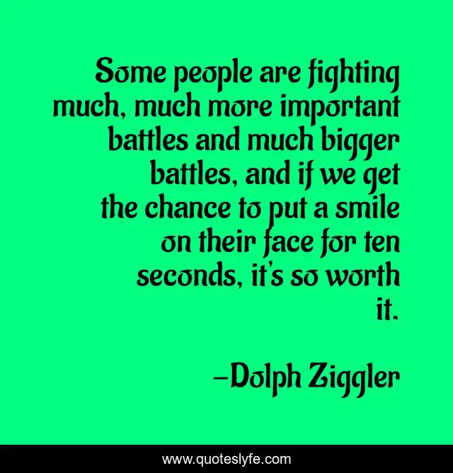This page presents the quote "Some people are fighting much, much more important battles and much bigger battles, and if we get the chance to put a smile on their face for ten seconds, it's so worth it.". Author of this quote is Dolph Ziggler. This quote is about chance, people, face,.
