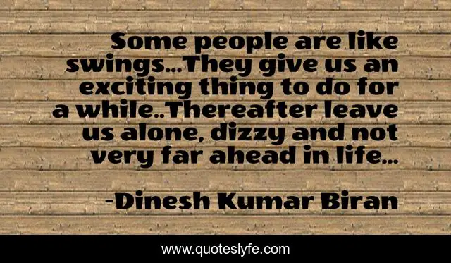This page presents the quote "Some people are like swings...They give us an exciting thing to do for a while..Thereafter leave us alone, dizzy and not very far ahead in life...". Author of this quote is Dinesh Kumar Biran. This quote is about longing, lonliness-love, fake-promises, hearbroken, idle-promises, unfulfilled-promises, lonliness,.