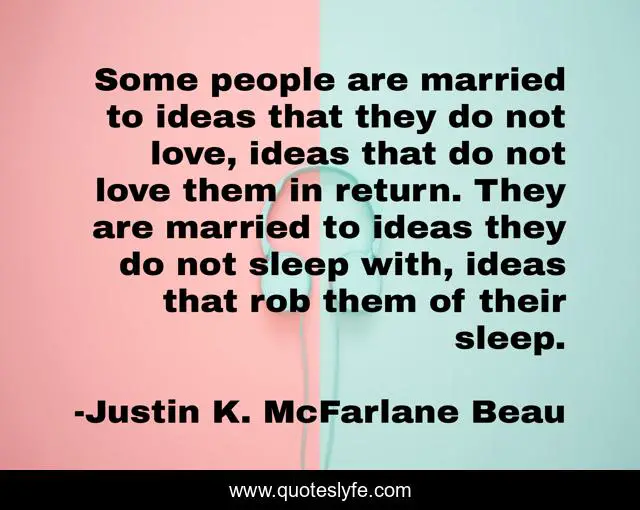 This page presents the quote "Some people are married to ideas that they do not love, ideas that do not love them in return. They are married to ideas they do not sleep with, ideas that rob them of their sleep.". Author of this quote is Justin K. McFarlane Beau. This quote is about people, confusion, mental-pain, ideas, rest, suffering, narcolepsy, marriage, sleep,.