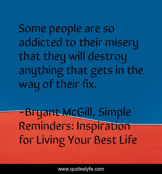 This page presents the quote "Some people are so addicted to their misery that they will destroy anything that gets in the way of their fix.". Author of this quote is Bryant McGill, Simple Reminders: Inspiration for Living Your Best Life. This quote is about addiction, destruction, dependence, misery,.