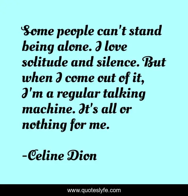This page presents the quote "Some people can't stand being alone. I love solitude and silence. But when I come out of it, I'm a regular talking machine. It's all or nothing for me.". Author of this quote is Celine Dion. This quote is about alone, silence, being alone,.