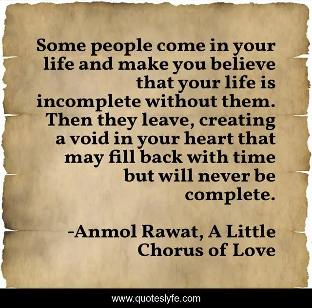 This page presents the quote "Some people come in your life and make you believe that your life is incomplete without them. Then they leave, creating a void in your heart that may fill back with time but will never be complete.". Author of this quote is Anmol Rawat, A Little Chorus of Love. This quote is about romance, love, romantic, affection, love-hurts,.