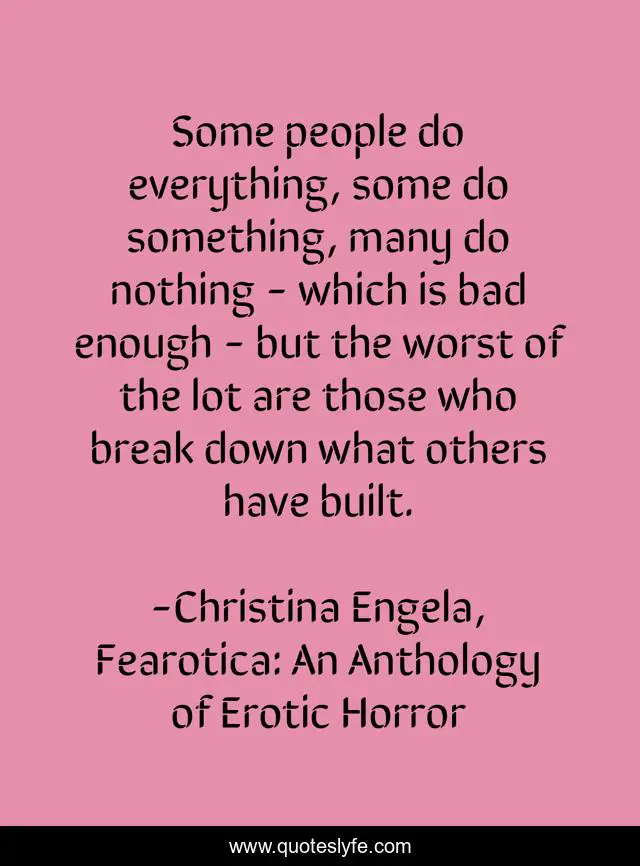 This page presents the quote "Some people do everything, some do something, many do nothing - which is bad enough - but the worst of the lot are those who break down what others have built.". Author of this quote is Christina Engela, Fearotica: An Anthology of Erotic Horror. This quote is about built, people, break-down, everything, bad, worst, something, nothing,.