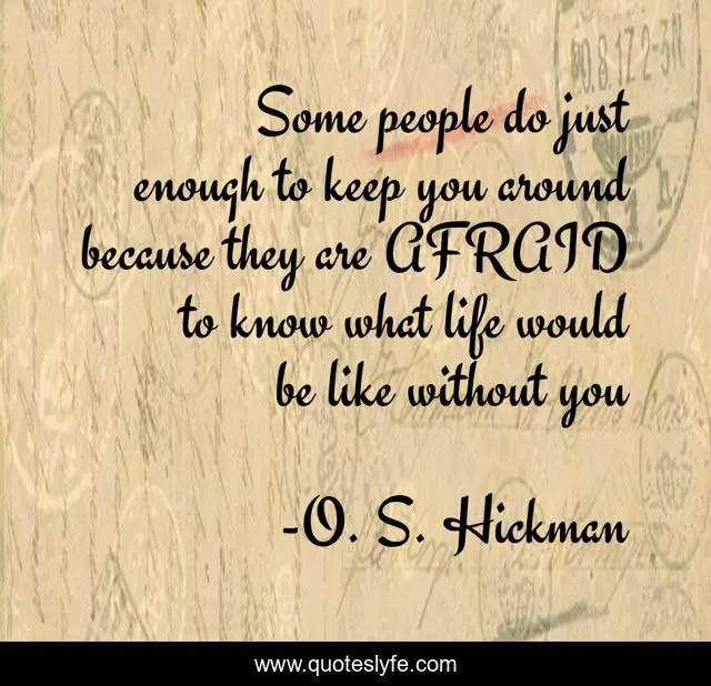 This page presents the quote "Some people do just enough to keep you around because they are AFRAID to know what life would be like without you". Author of this quote is O. S. Hickman. This quote is about broken-heart, freeloaders, get-over, love, dependent, divorce, deadbeat, parasite, sponge,.