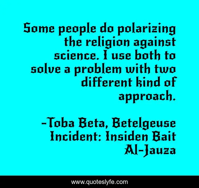This page presents the quote "Some people do polarizing the religion against science. I use both to solve a problem with two different kind of approach.". Author of this quote is Toba Beta, Betelgeuse Incident: Insiden Bait Al-Jauza. This quote is about different, science, religion, polarize, problem-solving, approach,.