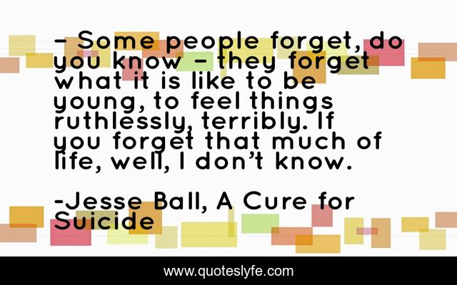 This page presents the quote "– Some people forget, do you know – they forget what it is like to be young, to feel things ruthlessly, terribly. If you forget that much of life, well, I don’t know.". Author of this quote is Jesse Ball, A Cure for Suicide. .