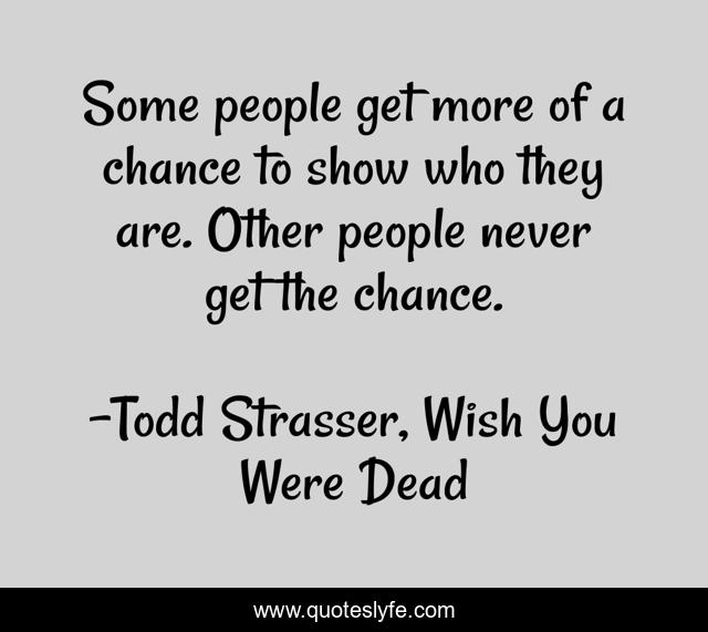 This page presents the quote "Some people get more of a chance to show who they are. Other people never get the chance.". Author of this quote is Todd Strasser, Wish You Were Dead. This quote is about wish-you-were-dead, chance, people, todd-strasser, show,.