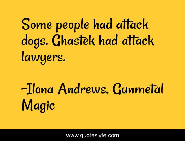 This page presents the quote "Some people had attack dogs. Ghastek had attack lawyers.". Author of this quote is Ilona Andrews, Gunmetal Magic. This quote is about lawyers, vampires,.