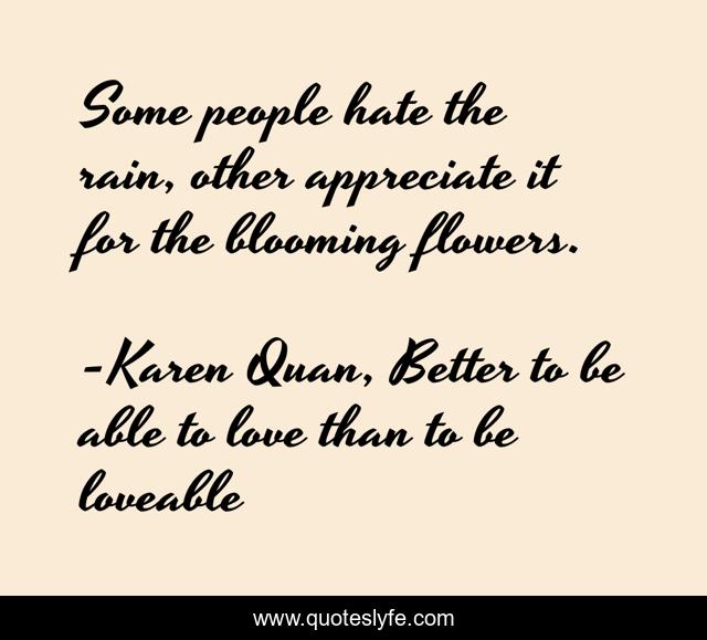 This page presents the quote "Some people hate the rain, other appreciate it for the blooming flowers.". Author of this quote is Karen Quan, Better to be able to love than to be loveable. This quote is about appreciate, flowers, hate, rain, people,.