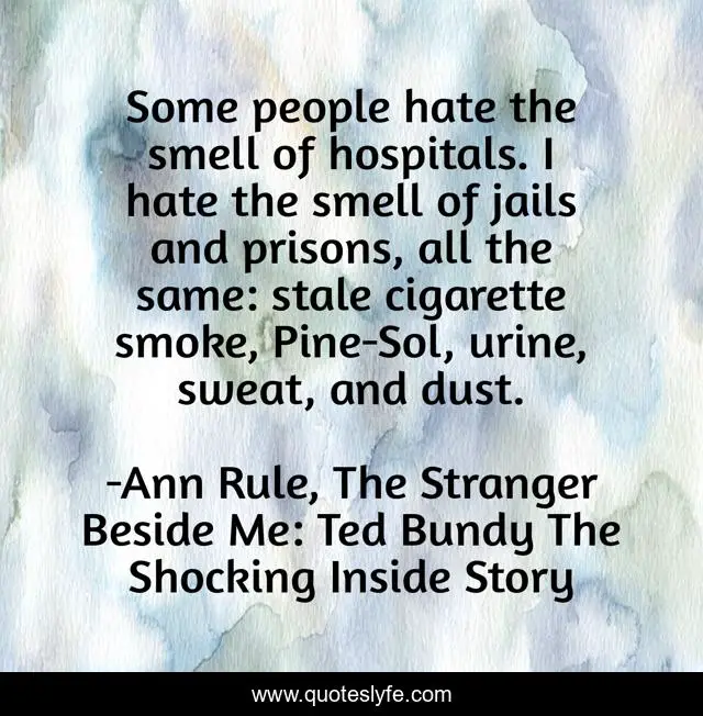 This page presents the quote "Some people hate the smell of hospitals. I hate the smell of jails and prisons, all the same: stale cigarette smoke, Pine-Sol, urine, sweat, and dust.". Author of this quote is Ann Rule, The Stranger Beside Me: Ted Bundy The Shocking Inside Story. This quote is about ann-rule, ted-bundy, jail, smells, prison,.