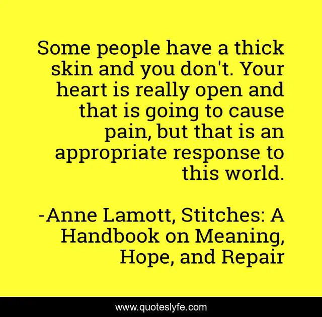 "Anne Lamott, Stitches: A Handbook on Meaning, Hope, and Repair Quotes." Quoteslyfe.com, 2025. Sun. 07 Dec. 2025. <https://www.quoteslyfe.com/quote/Some-people-have-a-thick-skin-and-219440>.