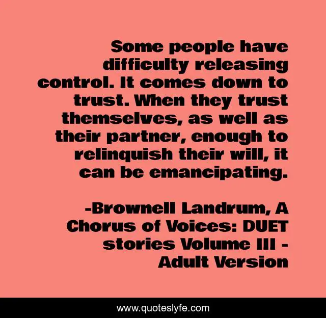 This page presents the quote "Some people have difficulty releasing control. It comes down to trust. When they trust themselves, as well as their partner, enough to relinquish their will, it can be emancipating.". Author of this quote is Brownell Landrum, A Chorus of Voices: DUET stories Volume III - Adult Version. This quote is about control, love, duet-stories, brownell-landrum, partner, trust, affection,.