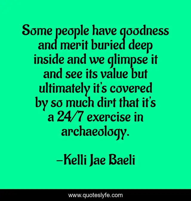 This page presents the quote "Some people have goodness and merit buried deep inside and we glimpse it and see its value but ultimately it's covered by so much dirt that it's a 24/7 exercise in archaeology.". Author of this quote is Kelli Jae Baeli. This quote is about goodness, value, people,.