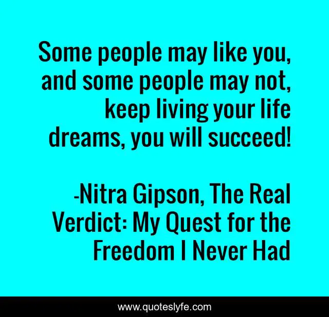This page presents the quote "Some people may like you, and some people may not, keep living your life dreams, you will succeed!". Author of this quote is Nitra Gipson, The Real Verdict: My Quest for the Freedom I Never Had. This quote is about enthusiasm, life-and-living, honesty, inspirational,.