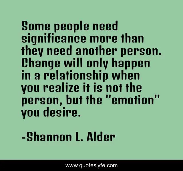 This page presents the quote "Some people need significance more than they need another person. Change will only happen in a relationship when you realize it is not the person, but the "emotion" you desire.". Author of this quote is Shannon L. Alder. This quote is about emotion, needs, self, significance, ego, relationships-101, need-for-validation, validation,.