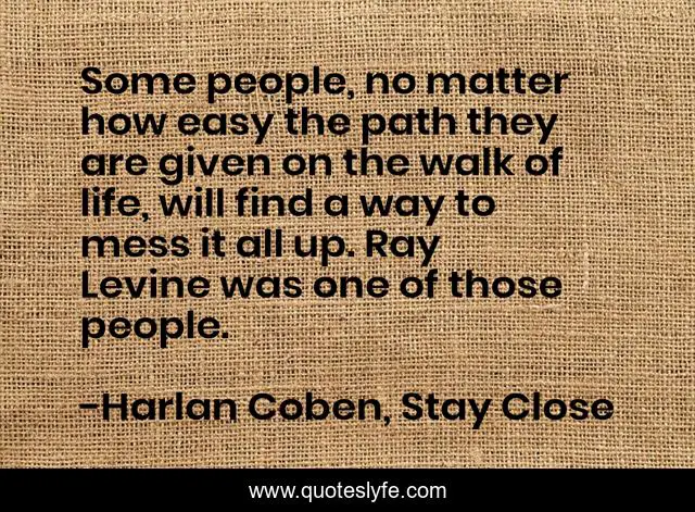 This page presents the quote "Some people, no matter how easy the path they are given on the walk of life, will find a way to mess it all up. Ray Levine was one of those people.". Author of this quote is Harlan Coben, Stay Close. This quote is about life, philosophical,.