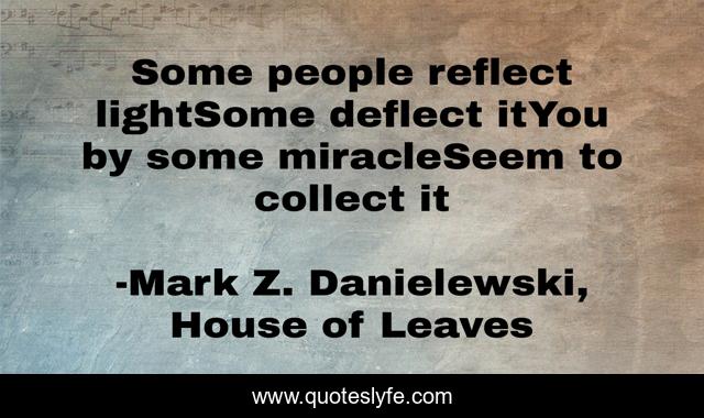 This page presents the quote "Some people reflect lightSome deflect itYou by some miracleSeem to collect it". Author of this quote is Mark Z. Danielewski, House of Leaves. This quote is about joy, love, miracle, affection, light,.