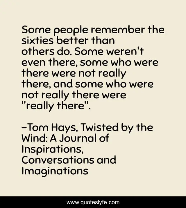 "Tom Hays, Twisted by the Wind: A Journal of Inspirations, Conversations and Imaginations Quotes." Quoteslyfe.com, 2025. Fri. 05 Dec. 2025. <https://www.quoteslyfe.com/quote/Some-people-remember-the-sixties-better-than-213920>.