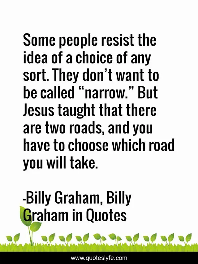 This page presents the quote "Some people resist the idea of a choice of any sort. They don’t want to be called “narrow.” But Jesus taught that there are two roads, and you have to choose which road you will take.". Author of this quote is Billy Graham, Billy Graham in Quotes. This quote is about billy-graham, choice,.