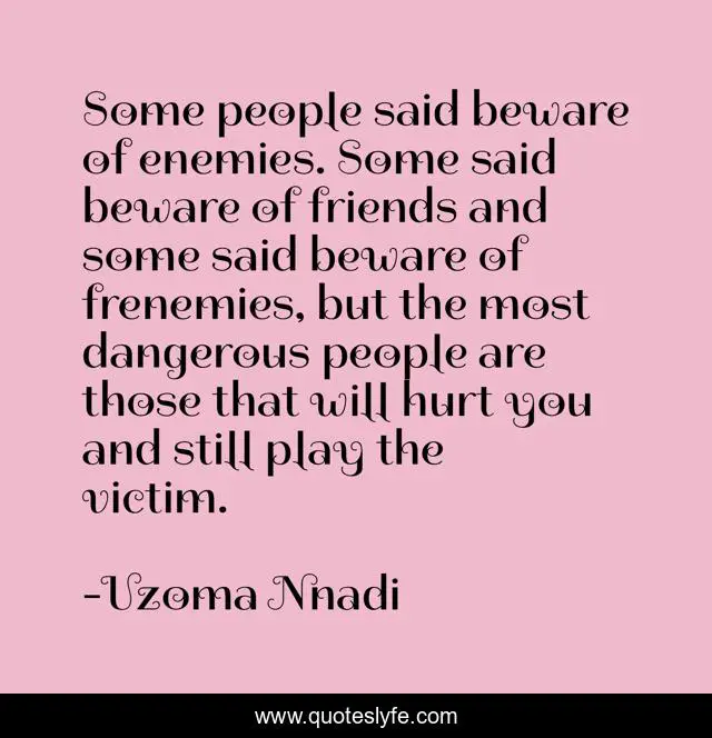 This page presents the quote "Some people said beware of enemies. Some said beware of friends and some said beware of frenemies, but the most dangerous people are those that will hurt you and still play the victim.". Author of this quote is Uzoma Nnadi. This quote is about frenemies, friends, enemies,.