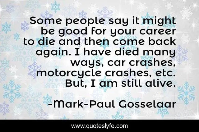 This page presents the quote "Some people say it might be good for your career to die and then come back again. I have died many ways, car crashes, motorcycle crashes, etc. But, I am still alive.". Author of this quote is Mark-Paul Gosselaar. This quote is about good, motorcycle,.