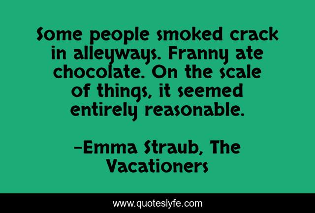 This page presents the quote "Some people smoked crack in alleyways. Franny ate chocolate. On the scale of things, it seemed entirely reasonable.". Author of this quote is Emma Straub, The Vacationers. This quote is about food, chocolate,.