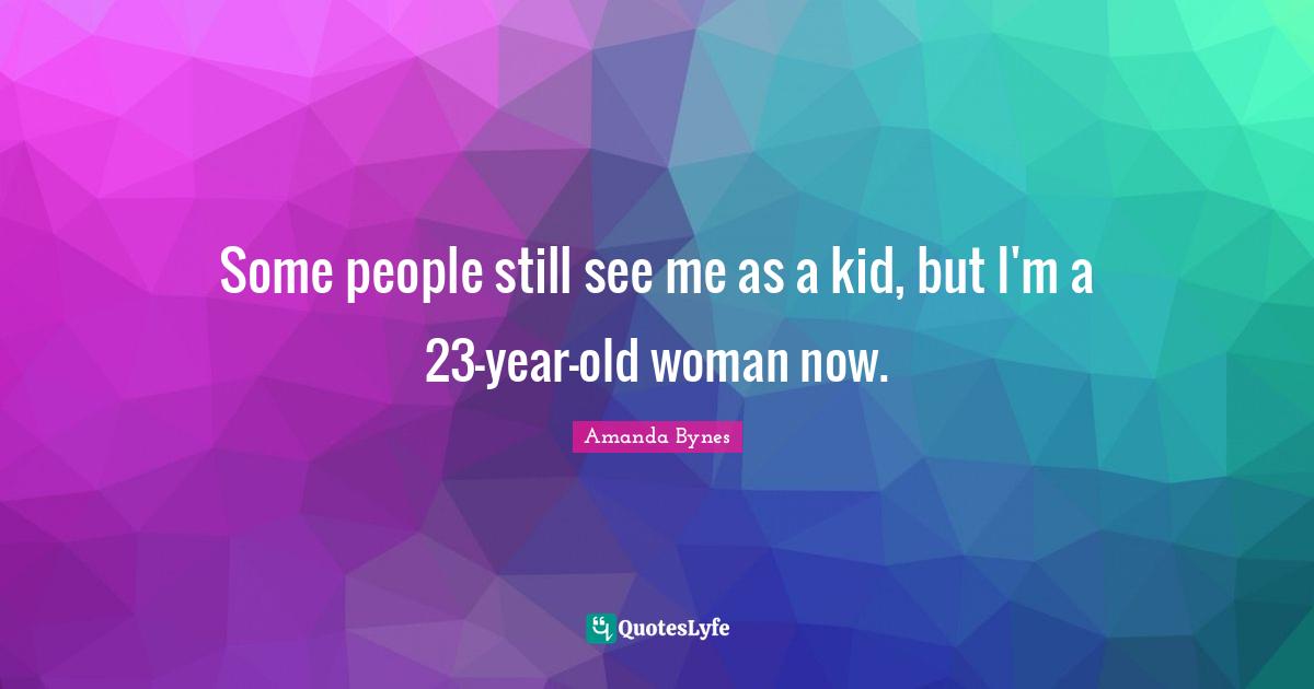 This page presents the quote "Some people still see me as a kid, but I'm a 23-year-old woman now.". Author of this quote is Amanda Bynes. This quote is about old woman, kids, people, years,.