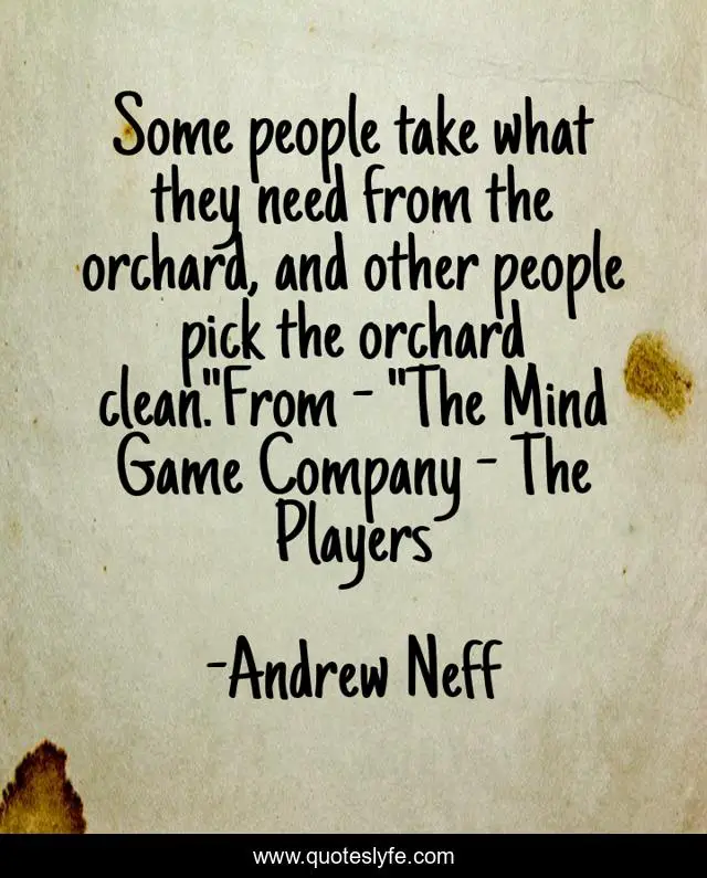 This page presents the quote "Some people take what they need from the orchard, and other people pick the orchard clean."From - "The Mind Game Company - The Players". Author of this quote is Andrew Neff. This quote is about 99-percent, deception, suggestions, remedy, greed, fallacy,.