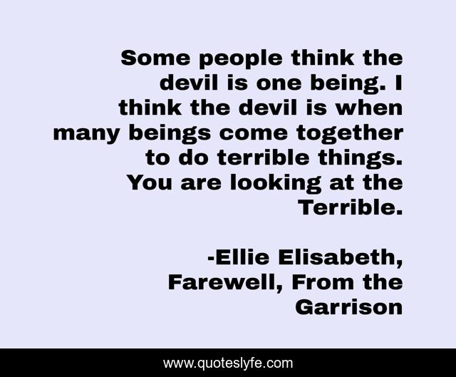 This page presents the quote "Some people think the devil is one being. I think the devil is when many beings come together to do terrible things. You are looking at the Terrible.". Author of this quote is Ellie Elisabeth, Farewell, From the Garrison. This quote is about devil, demon, demons, apocalypse,.