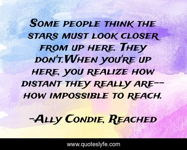 This page presents the quote "Some people think the stars must look closer from up here. They don't.When you're up here, you realize how distant they really are--how impossible to reach.". Author of this quote is Ally Condie, Reached. This quote is about quote, ky, reached,.