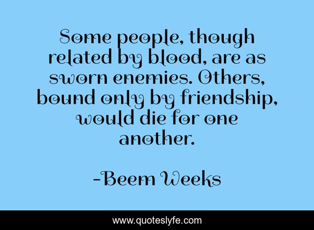This page presents the quote "Some people, though related by blood, are as sworn enemies. Others, bound only by friendship, would die for one another.". Author of this quote is Beem Weeks. This quote is about friends, family-drama, friendship, family,.