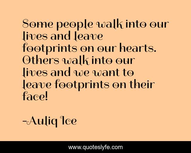 This page presents the quote "Some people walk into our lives and leave footprints on our hearts. Others walk into our lives and we want to leave footprints on their face!". Author of this quote is Auliq Ice. This quote is about love, death-of-a-loved-one, divorce, life-lessons, memories, friendship, affection,.