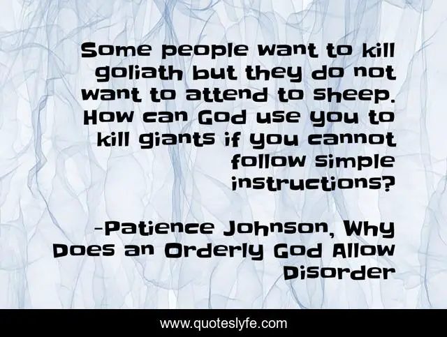 "Patience Johnson, Why Does an Orderly God Allow Disorder Quotes." Quoteslyfe.com, 2025. Mon. 08 Dec. 2025. <https://www.quoteslyfe.com/quote/Some-people-want-to-kill-goliath-but-20667>.