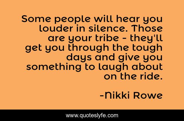 This page presents the quote "Some people will hear you louder in silence. Those are your tribe - they'll get you through the tough days and give you something to laugh about on the ride.". Author of this quote is Nikki Rowe. This quote is about lessons, tribe, life, companionship, soul-family, friendship, soul, growth, soul-mate,.