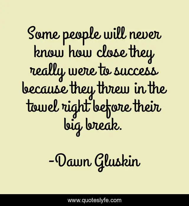 This page presents the quote "Some people will never know how close they really were to success because they threw in the towel right before their big break.". Author of this quote is Dawn Gluskin. This quote is about perseverance, keep-goinglove, success,.