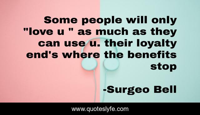This page presents the quote "Some people will only "love u " as much as they can use u. their loyalty end's where the benefits stop". Author of this quote is Surgeo Bell. This quote is about money, making-money, respect, trust, relationships, god, responsibility, happy, poor,.