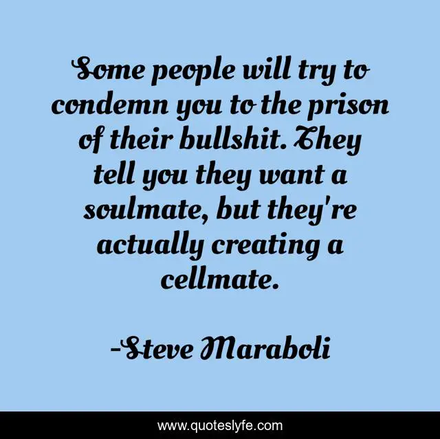 This page presents the quote "Some people will try to condemn you to the prison of their bullshit. They tell you they want a soulmate, but they're actually creating a cellmate.". Author of this quote is Steve Maraboli. This quote is about relationships, relationship, soulmates, poison, truth, toxic,.