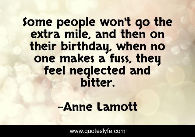 This page presents the quote "Some people won't go the extra mile, and then on their birthday, when no one makes a fuss, they feel neglected and bitter.". Author of this quote is Anne Lamott. This quote is about feel, people, extra mile,.