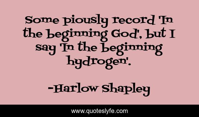 This page presents the quote "Some piously record 'In the beginning God', but I say 'In the beginning hydrogen'.". Author of this quote is Harlow Shapley. This quote is about humor, science, cosmology, big-bang, astronomy, hydrogen, pious,.